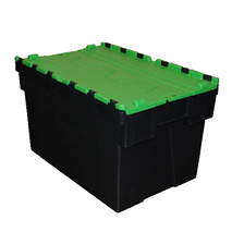 Heavy-duty attached lid containers are made from robust, repro plastic (a recycled material). They are stackable when full and nestable when empty, helping with efficient storage in transit and when not in use. Available in black with a green lid made from a combination of repro and virgin materials, or entirely in black from repro material.